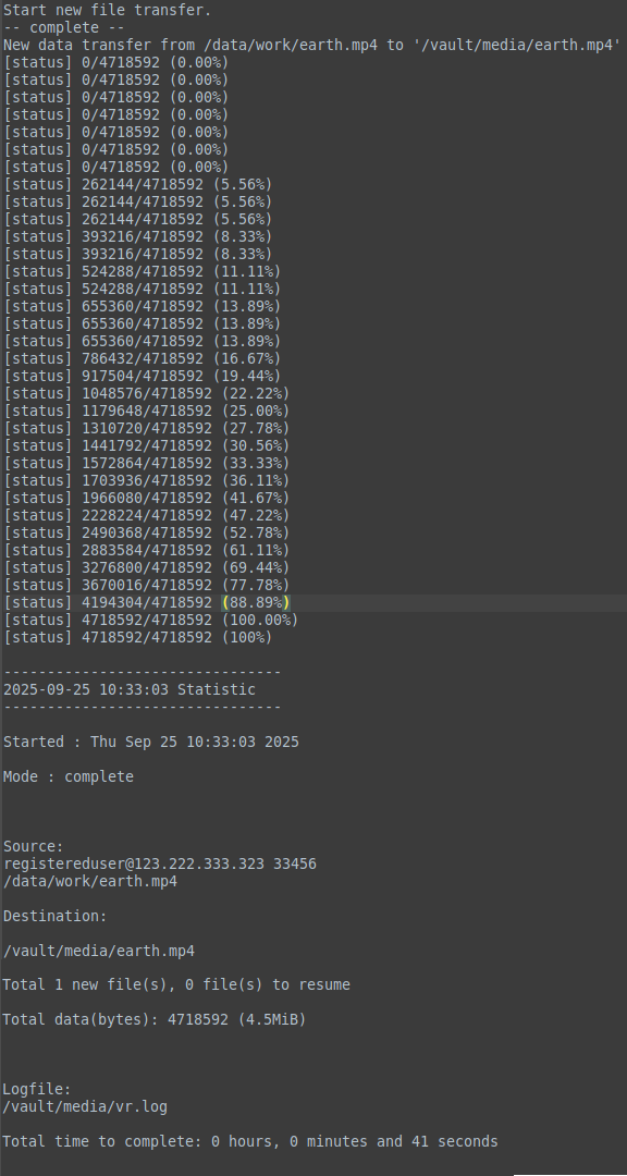 https://www.1range1.com/index.php#download New changes(changelog): ----------------------------- -Add and improve on new information on vrangesync official site -Fix various known 'ncat' bugs -Fix a bug related to 'ncat connection & data transfer' -Fix a bug related to 'ssh connection & data transfer' -Add feature to stop any active running vrangesync on current & remotemachine when vrangesync get interrupted abruptly -Add feature for 'on-the-fly status report' for file transfer Note on using 'remote-to-currentpc' feature ------------------------------------------ -If you plan to send file from 'remotePC' to your 'currentPC' using 'remote-to-currentpc'('ncat'), your 'currentPC' need a valid IPv4/IPv6 address for 'remotePC' to connect to your 'currentPC' -An alternative is using 'remote-to-currentpc'(ssh) Image of 'on-the-fly status report' for file transfer feature ![]() |